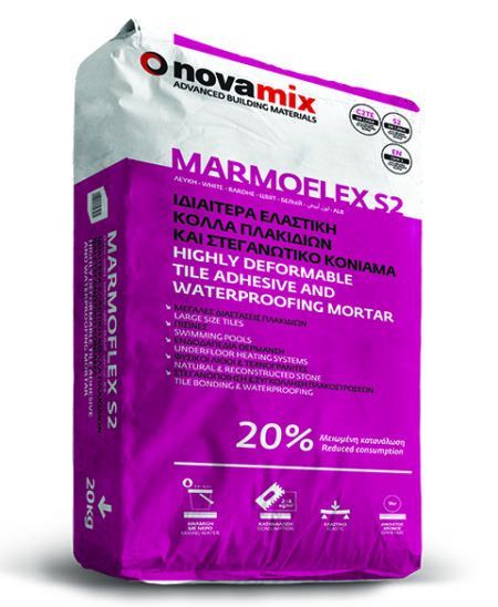 Ενός συστατικού ιδιαίτερα ελαστική και ισχυρή κόλλα πλακιδίων που λειτουργεί και σαν στεγανωτικό κονίαμα. Έχει επιδόσεις συγκόλλησης που κατά περίπτωση είναι τριπλάσιες από τις απαιτούμενες των προτύπων που διέπουν τις κόλλες πλακιδίων. Έχει διευρυμένο ανοιχτό χρόνο εφαρμογής (> 60 λεπτά) με εφαρμογή και σε υψηλές θερμοκρασίες (+45oC). Είναι ιδανική για τοποθέτηση πλακιδίων μεγάλων και πολύ μεγάλων διαστάσεων. Κατάλληλη και για τοποθέτηση λευκού μαρμάρου ή ανακατασκευασμένων πετρωμάτων (εκτός αυτών με βάση κόκκινο ή πράσινο μάρμαρο). Κατάλληλη για πισίνες, προσόψεις, ενδοδαπέδια θέρμανση, πλακάκι σε πλακάκι, ακόμη και για τοποθέτηση πλακιδίων σε κόντρα πλακέ σε εξωτερικούς χώρους (ISO 13007-1:2010 C2TE S2 P2) . Για στεγανοποίηση σε ένα βήμα η εφαρμογή να γίνεται με σπάτουλα Νο 12 σε επίπεδη επιφάνεια. Για πισίνες, βαριά πλακίδια ή εφαρμογή συγκόλλησης & στεγανοποίησης σε δύο στάδια, προηγείται στρώση σε πάχος 2mm και μετά από 6 ώρες ακολουθεί η συγκόλληση του πλακιδίου. Εξαιτίας της ειδικής της σύνθεσης παρέχει μειωμένη κατανάλωση κατά 20% σε σχέση με τις συνήθεις κόλλες πλακιδίων, επιτυγχάνοντας με αυτό τον τρόπο και μείωση του κόστους μεταφοράς και εργασίας.