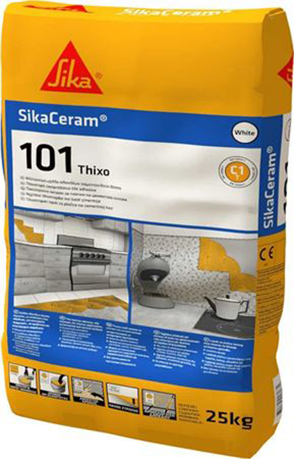 ΚΟΛΛΑ ΠΛΑΚΙΔΙΩΝ ΤΣΙΜΕΝΤΟΕΙΔΟΥΣ ΒΑΣΗΣ, ΚΑΤΗΓΟΡΙΑΣ C1Τ ΣΥΜΦΩΝΑ ΜΕ ΕΝ 12004-1 Η SikaCeram®-101 Thixo είναι ενός συστατικού, τσιμεντοειδής λευκή κόλλα πλακιδίων, μειωμένης ολίσθησης, με επιλεγμένα αδρανή, ειδικά πρόσμικτα και πολυμερή. Η SikaCeram®-101 Thixo μπορεί να χρησιμοποιηθεί για συγκόλληση πλακιδίων σε πάχος στρώσης μέχρι 10mm, σε εσωτερικές εφαρμογές, σε οριζόντιες και κατακόρυφες επιφάνειες. -Υψηλής θιξοτροπίας χωρίς κατακόρυφη ολίσθηση -Εξαίρετη πρόσφυση στα περισσότερα υποστρώματα -Ταχύτητα εφαρμογής-ευκολία στη διάστρωση