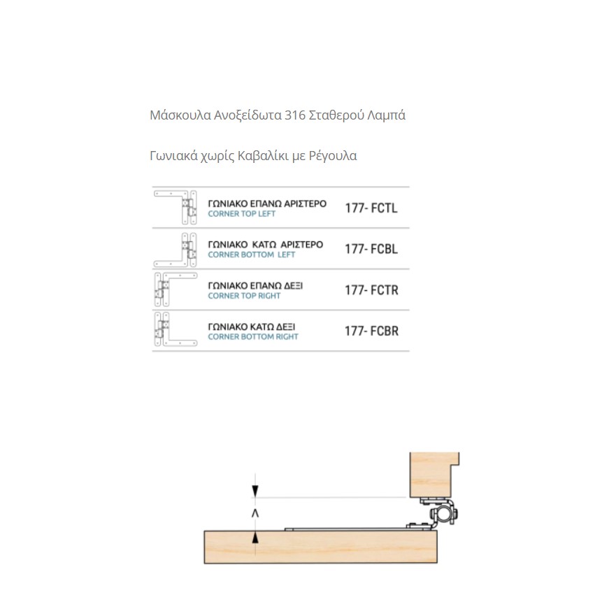 Μάσκουλα γωνιακά σταθερού λαμπά με ρέγουλα για φύλλο χωρίς καβαλίκι κατασκευασμένα από 100% ανοξείδωτο αντιμαγνητικό ατσάλι χάλυβα 316 με μέγιστη αντοχή στην φθορά και στην οξείδωση. Τα μάσκουλα παραγγέλντωνται βάση του λαμπά και βάση του αν τοποθετούνται σε παράθυρο ή μπαλκονόπορτα. Κάθε παράθυρο χρειάζεται 2 μάσκουλα ενώ κάθε μπαλκονόπορτα χρειάζεται 3 μάσκουλα. Στην καταχώρηση της παραγγελίας χρειάζεται να γνωρίζουμε εκτός από το μέγεθος του λαμπά που επιλέγετε και αν το μάσκουλο θα είναι επάνω αριστερό, κάτω αριστερό , επάνω δεξί , κάτω δεξί.