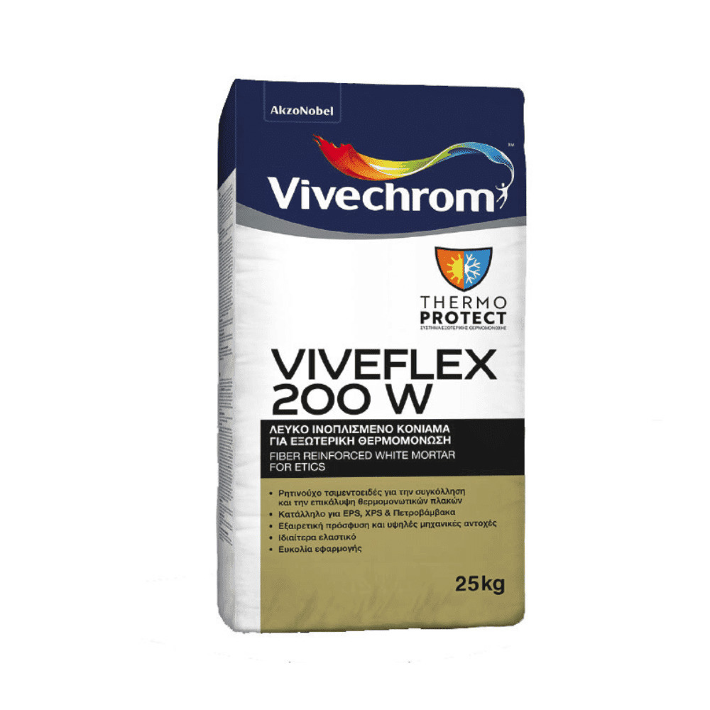 Το VIVEFLEX 200W της Vivechrom είναι λευκό ινοπλισμένο τσιμεντοειδές κονίαμα για την συγκόλληση και την επικάλυψη θερμομονωτικών πλακών διογκωμένης πολυστερίνης (EPS), εξιλασμένης πολυστερίνης (XPS) και πετροβάμβακα. Έχει μεγάλη ελαστικότητα ενώ παρουσιάζει εξαιρετική πρόσφυση σε υποστρώματα όπως μπετό, τούβλα, επιχρίσματα, θερμομονωτικές πλάκες κλπ. Έχει υψηλές μηχανικές αντοχές καθώς και μεγάλες αντοχές στις αλλαγές θερμοκρασίας (ζέστη, βροχή, κρύο). Εφαρμόζεται εύκολα, τόσο σαν κονίαμα επικόλλησης (κόλλα) όσο και σαν οπλισμένο επίχρισμα για την αντιρρηγματική στρώση.