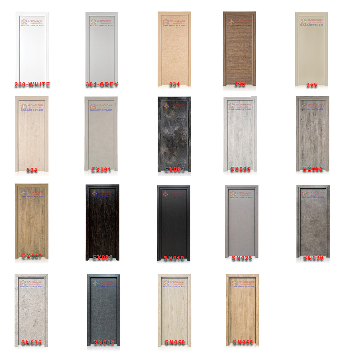 Όλες οι πόρτες είναι κατασκευασμένες από M.D.F. 7 mm, με πλήρωση χαρτοκυψέλης και τελάρο λευκής ξυλείας FINGER JOINT. Οι κάσες είναι κατασκευασμένες από BLOCK BOARD διατομής 75-100-130-150-180-240 Χ 40 mm, ίσιες ή oval. Όλα τα περβάζια είναι κατασκευασμένα από κοντραπλακέ διατομής 6,5 Χ 9 mm ίσια και 6,5 Χ 15 mm oval. Τα πορτόφυλλα φέρουν τοποθετημένη κλειδαριά καθώς και τρία διπλά βαρελάκια. Οι κάσες φέρουν το κυπρί της κλειδαριάς καθώς και τα τρία διπλά βαρελάκια. Τα λάστιχα είναι τοποθετημένα στις κάσες. Οι κάσες διαθέτουν φαλτσομόρσο.
